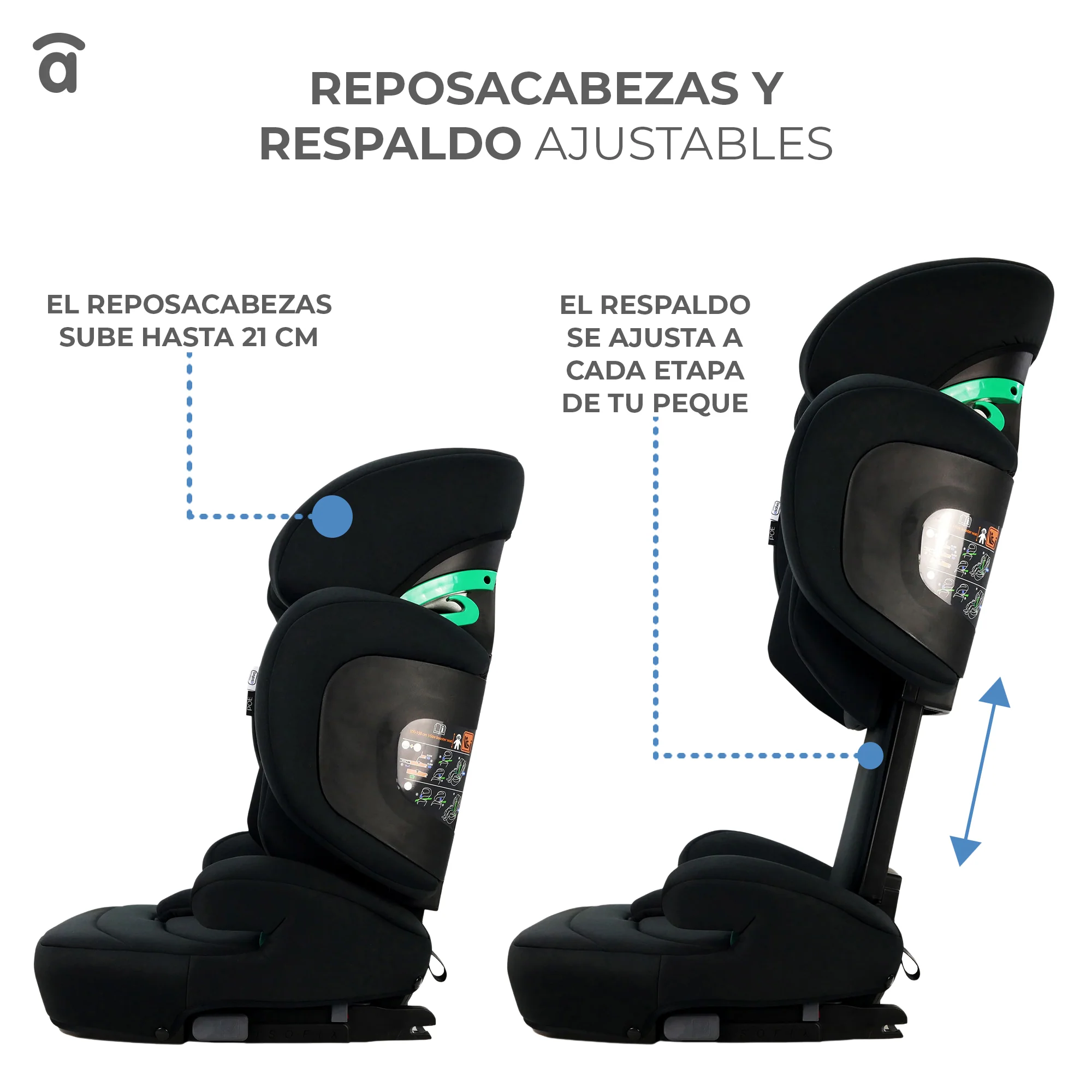 • Adjustable headrest (up to 21 cm) to grow with the child