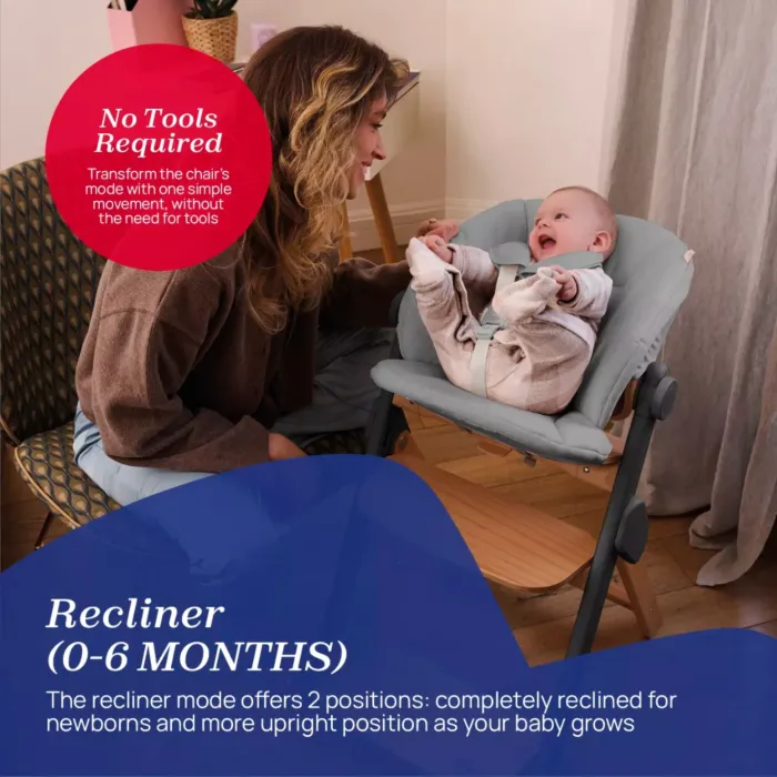 • 4-in-1 multi-stage highchair: Transforms into a recliner, highchair, child chair, and adult chair.