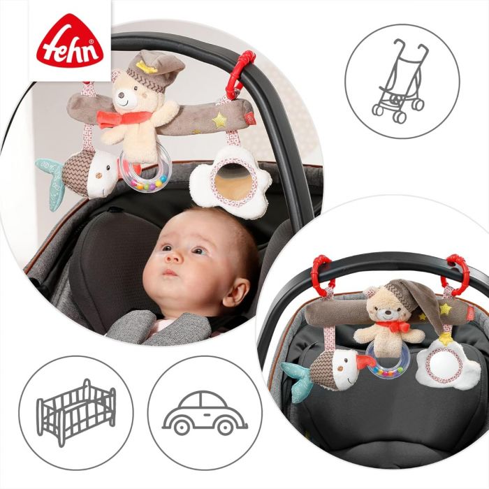 The built-in rattle ring, squeaker, baby-safe mirror and hidden crinkle paper offer a variety of sensory experiences that keep babies engaged. The soft textures invite little hands to grab and feel, while the cheerful sounds attract attention and stimulate early development. Easy to attach using the practical rings, the Bruno Activity Trapeze can be fitted to a baby seat, pram, cot or playpen, making it perfect for home or travel. Machine washable and independently safety-tested, it quickly becomes a favourite companion for everyday play.