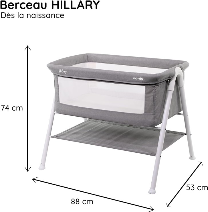 Measuring 74 cm high, 88 cm long, and 53 cm wide, the Nania HILLARY co-sleeping crib  fits perfectly in parents’ space while remaining easy to move . The crib’s legs are equipped with non-slip pads, providing maximum stability and safety for your child.