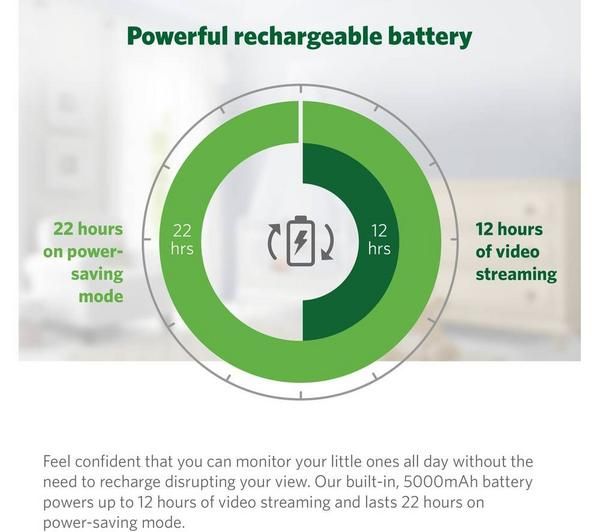 With up to 12 hours of video streaming and 24 hours of audio monitoring on a full charge, the long-lasting 5,000mAh rechargeable battery gives you uninterrupted monitoring day and night.
