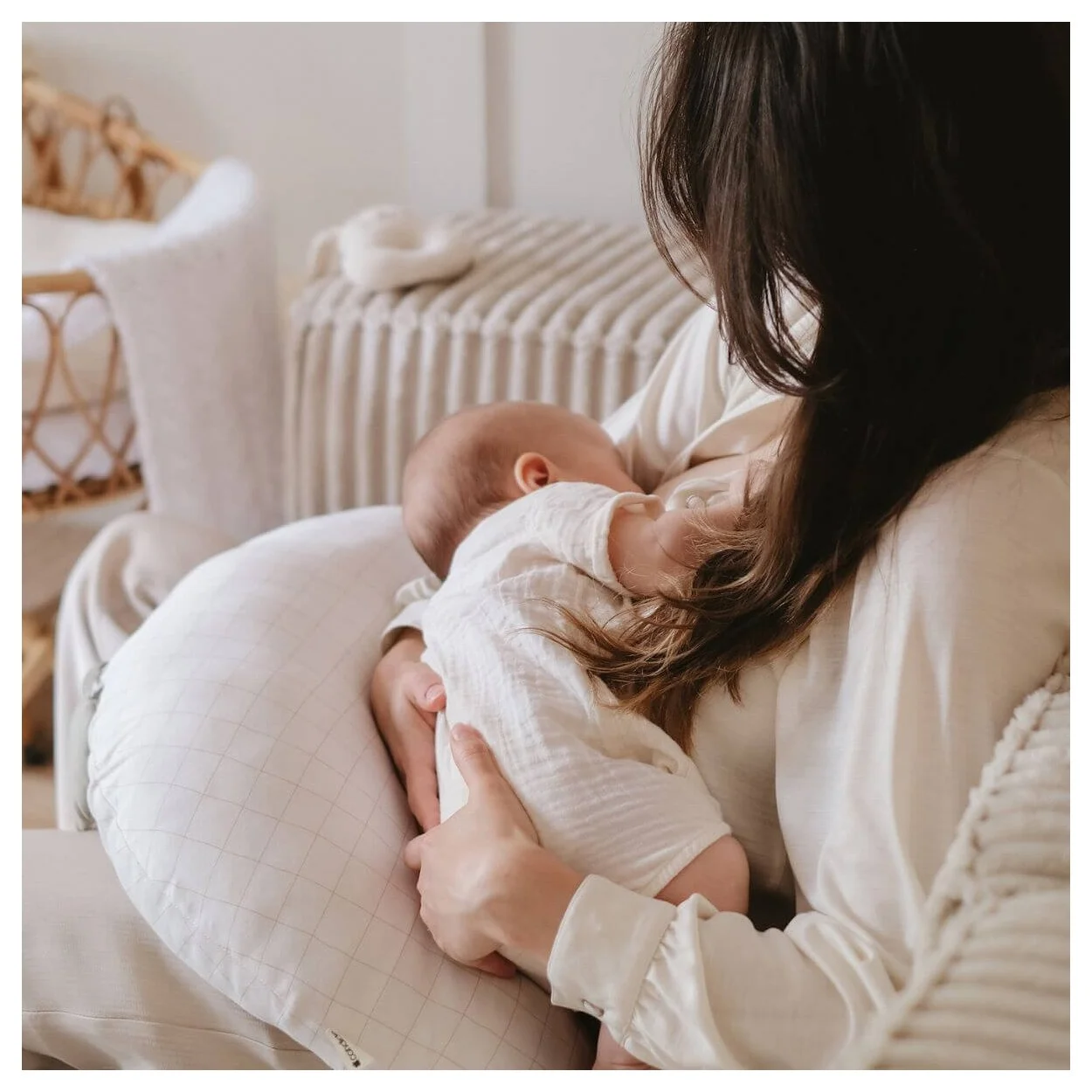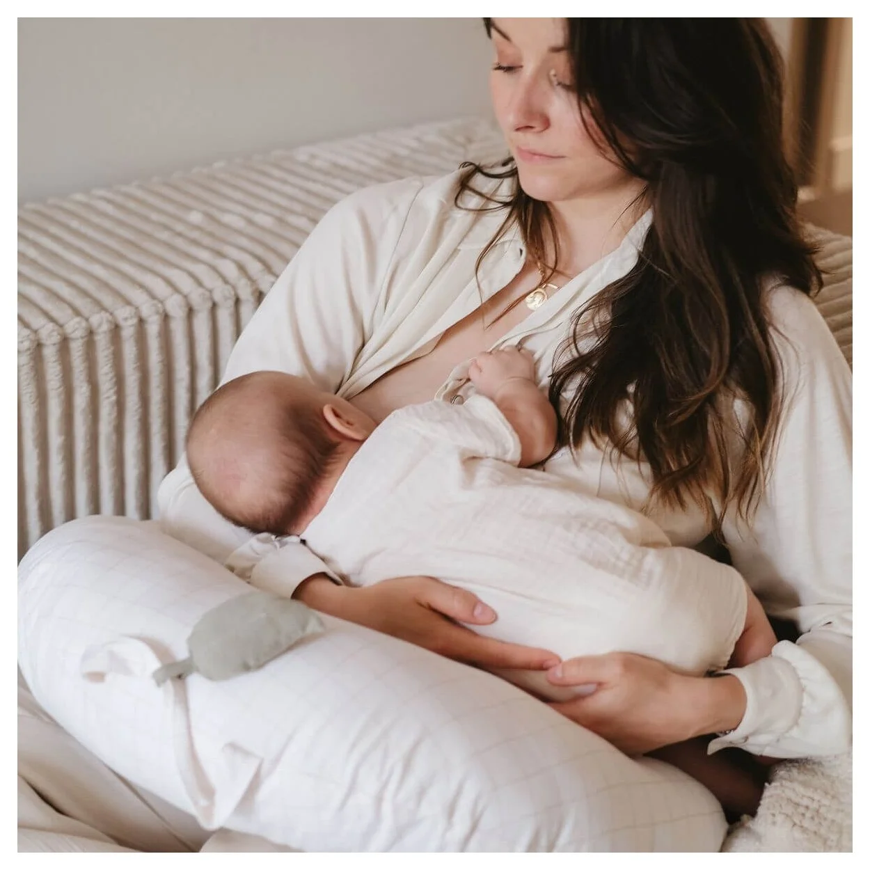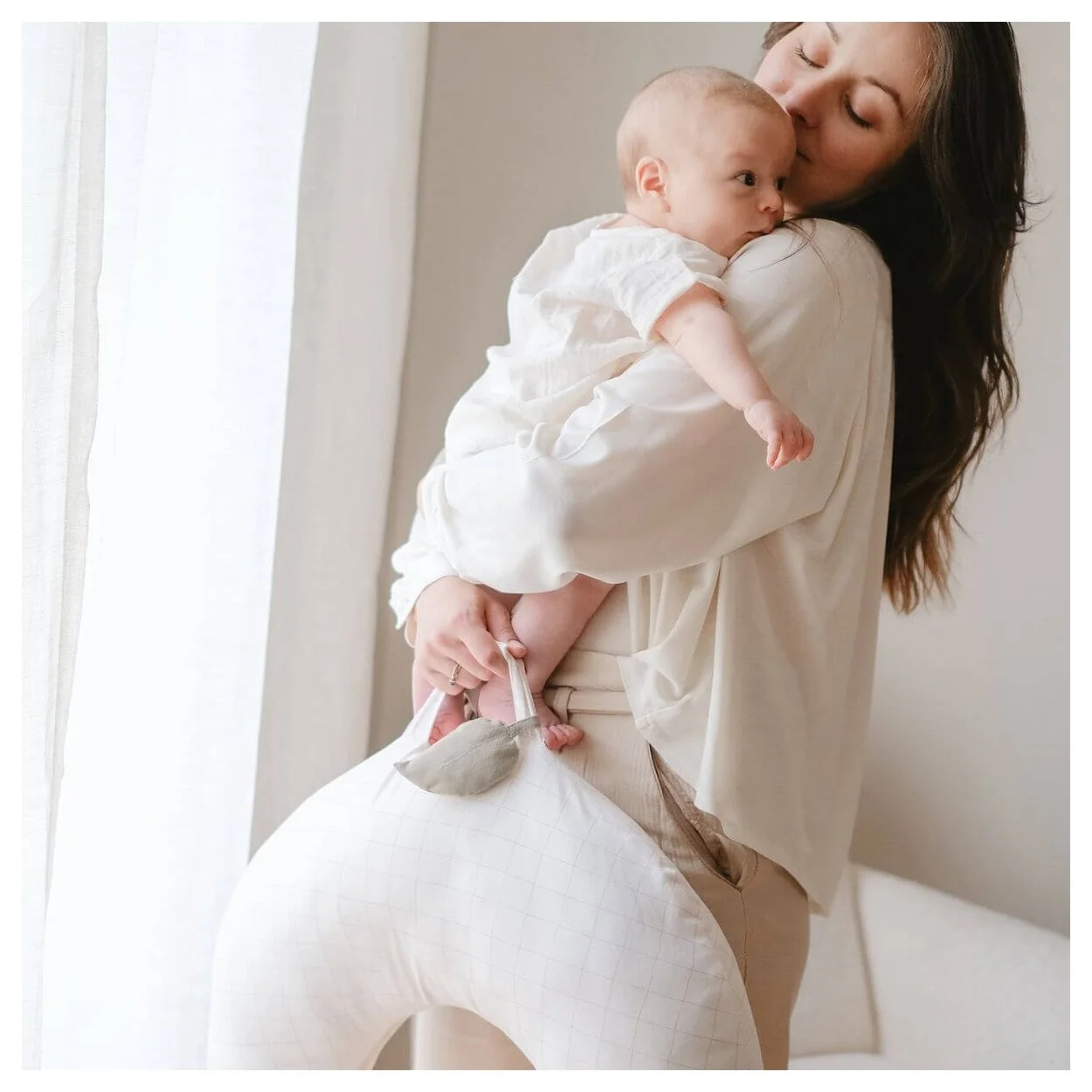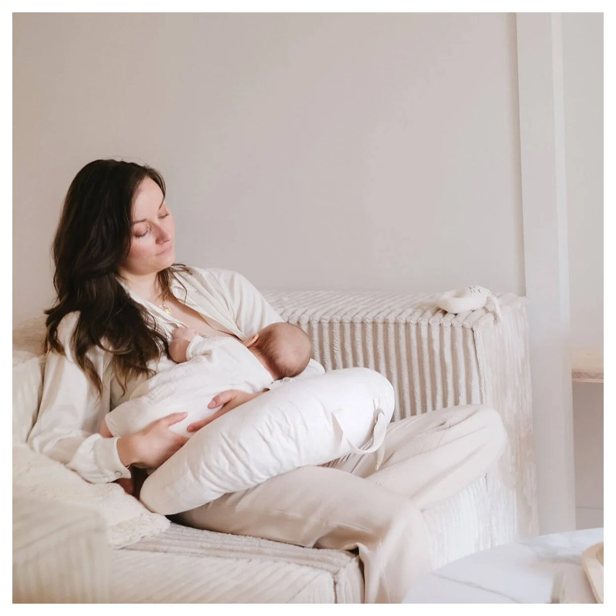 Its ergonomic shape effectively relieves the back, belly, and legs during pregnancy. After birth, it becomes an essential companion for comfortably positioning baby during breastfeeding or bottle-feeding, while keeping baby at the right height.