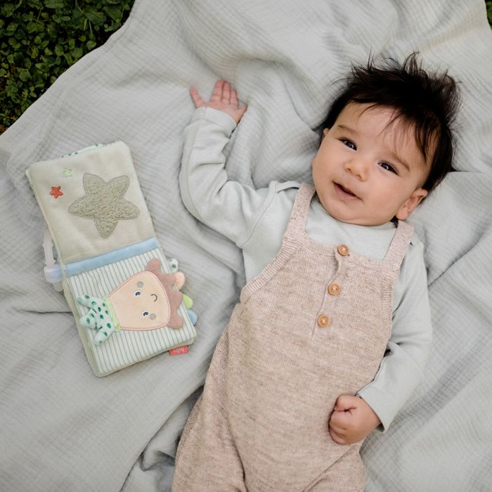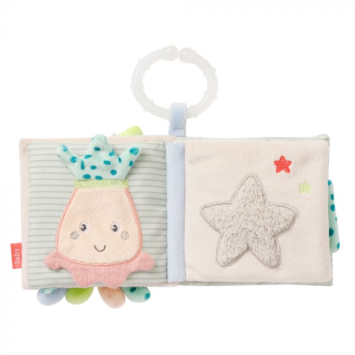 The octopus soft book invites your baby to discover the magical underwater world of the children of the sea. Octopus, seahorse, and fish provide a lot of fun while browsing and exploring 8 exciting pages. The squeak, crinkly paper & mirror offer lots of and is a great toy for developing visual and sensory skills . The C-ring allows easy attachment to the pushchair, pram, crib or car seat. For great playing fun – whether at home or on the go!